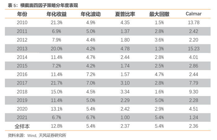图20展示的是展期收益、基差动量和库存二因子组合下的横截面四因子策略表现,无杠杆策略整体年化收益12.8%,比趋势策略略低,但波动和回撤优势明显,夏普比和Calmar均达2.3以上。横截面策略也能每年实现正收益。