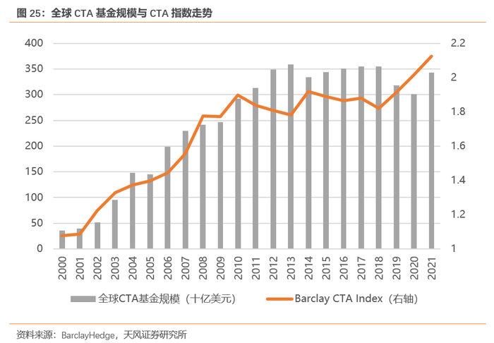 根据BarclayHedge的统计数据,截止到2021年第三季度末,全球CTA基金管理规模达到了3430亿美元,相比2020提升14%。截至2022年1月23日公布的数据,Barclay CTA指数在2021年上涨5.25%,连续三年增长5%以上。