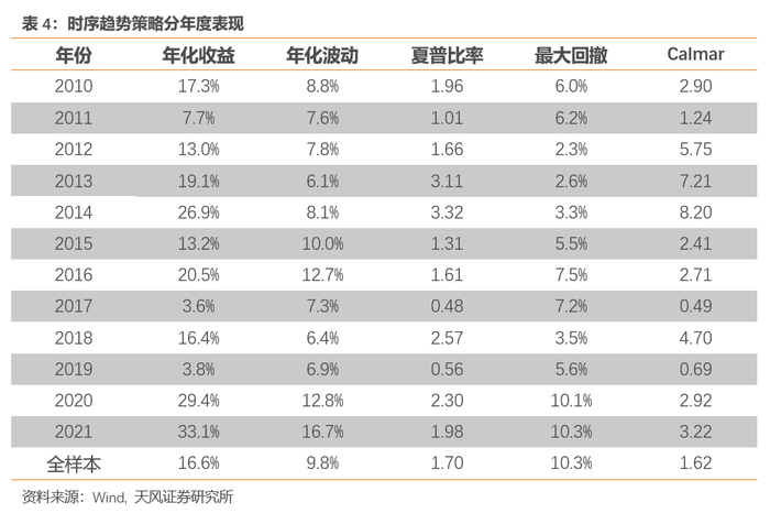 图17展示的是近月合约下时序趋势策略2010年以来的净值走势,策略整体年化收益16.6%,夏普比1.7,Calmar1.6,每年都能实现正收益。2021年收益率高达33.1%,在收益率创新高的同时,波动和回撤也创下新高。
