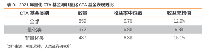 进一步,我们利用朝阳永续私募数据库,统计了上市满两年、且净值公布至2021年12月31日以后共859只CTA私募基金产品在2021年的表现。整体来看, CTA私募基金产品2021年平均收益率为12.9%,中位数收益率6.7%。对比来看,非量化类产品平均表现优于量化类产品。