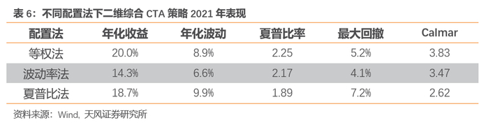 最后,我们观察叠加干预后二维综合CTA策略的表现。等权配置法下,叠加空仓或做空干预的策略各项指标均有改善,做空干预策略的收益率为22.7%,夏普比2.8,Calmar高达5.7。相比无干预策略收益率提升2.7%,回撤降低1.2%。