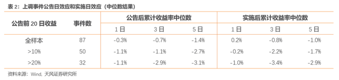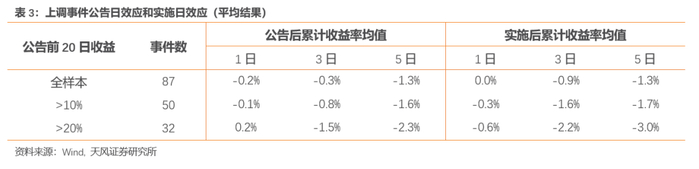 公告前20日涨幅大于10%的事件品种,在公告后1日、3日、5日的累计收益中位数为-1.1 %、-1.1%和-2.7%,累计收益均值为-0.1%、-0.8%和-1.6%,实施后1日、3日、5日的累计收益中位数为-0.2%、-2.2%和-1.7%,累计收益均值为-0.3%、-1.6%和-1.7%。