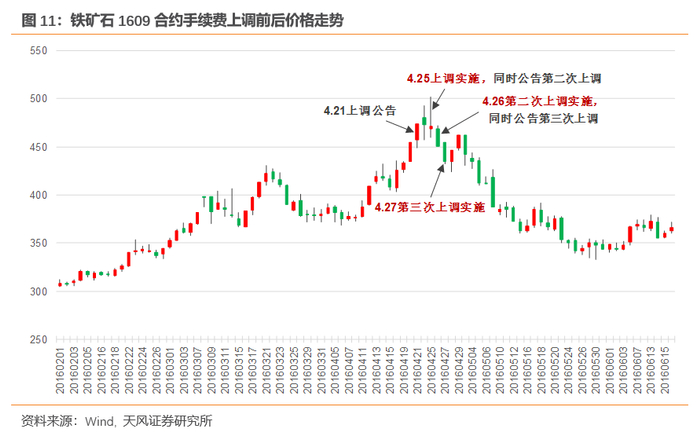 2016年上半年,在供给侧改革持续发力的背景下,黑色系表现强势。铁矿石1609合约自2月开始,在不到三个月的时间涨逾50%。为了避免风险持续放大,大商所于4月21日、4月25日、4月26日分别发布了上调交易手续费的公告,随后铁矿石价格急转直下,迎来了一个多月的持续下跌。