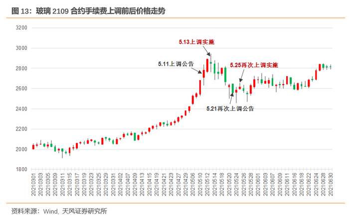 再看玻璃期货在2021年5月经历的两次手续费上调事件的影响。在经历了近两个月的强势上涨后,郑商所于5月11日发布上调玻璃期货交易手续费的公告,自5月13日实施日起,玻璃2109合约结束单边上涨行情,一周跌近8%。随后,5月25日郑商所再次上调手续费,玻璃期货开启了一个月的震荡行情。