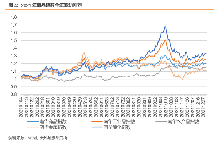 在全球流动性宽松、供需偏紧、极端天气等因素共同作用下,2021年商品市场延续牛市行情,大部分商品价格持续攀升,南华商品指数全年上涨20.9%。尤其是工业品,在限电限产政策下,焦煤焦炭等多个品种在10月创下历史新高。但在5月和10月监管出手降温后,强势品种均迎来较大幅度的价格反转。