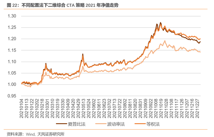 从时序和横截面二维综合CTA策略2021年的表现来看,等权法下,收益率20%,夏普比2.3,Calmar达3.8,收益风险比相对单一维度策略得到了明显提升。