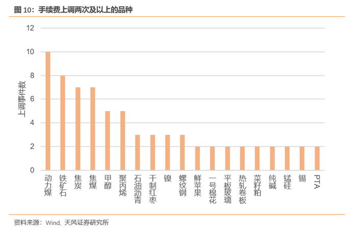 分板块看,交易所上调黑色系品种手续费共40次,占比达46%,其次是化工品,上调24次,占28%。其中上调次数最多的品种为动力煤、铁矿石、焦煤、焦炭,上调次数两次及以上的品种有19个。