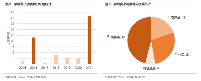 交易手续费是交易所调控期货风险的手段之一,一般当合约短期价格波动较大或临近到期时,交易所会调高相应合约的交易手续费。我们根据手续费上调的原因将事件分为“主动上调”和“被动上调”。2015年以来,交易所主动上调手续费共87次,涉及34个品种,其中2021年主动上调次数最多,达42次。分板块看,黑色系品种上调次数最多,占46%。