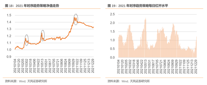 时序趋势策略全年经历了三波急涨急跌行情,分别发生在3月、5月和9-10月,这三个阶段正好伴随着前期大涨品种的手续费上调事件,3月是乙二醇和苯乙烯,5月是玻璃和动力煤,9-10月是黑色系品种的全面上调。从图19每日杠杆水平来看,仓位管理其实本质上是一种风控手段,在这三个波动放大的阶段仓位不断降低,但对趋势刚开始反转时候的回撤还是无能为力。