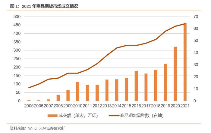 2021年商品期货市场单边总成交金额达462.8万亿元,同比增加43.7%,活跃度持续上升。从近三年的交易品种数量和整体成交情况来看,商品期货市场均处于快速发展阶段。随着上市品种的不断丰富,期现货投资者的投机和套期保值需求得到了越来越充分的满足。交易品种上,2021年新增上市了两个农产品期货品种,分别为大商所的生猪期货和郑商所的花生仁期货。目前共有64个上市交易品种。