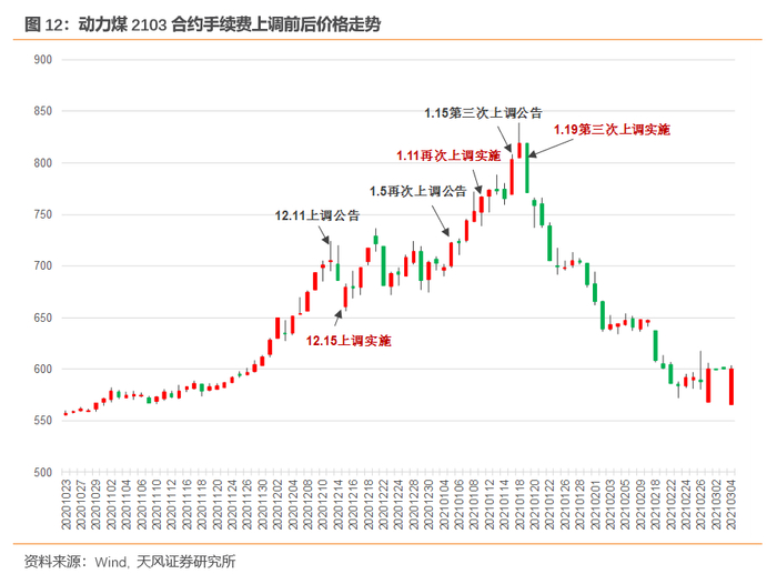 2020年下半年,动力煤供弱需强的矛盾集中爆发,11月开始持续上行,动力煤2103合约一个月时间暴力拉升20%以上。随后郑商所在1个月左右的时间里连续三次出台上调动力煤交易手续费的政策,试图为市场降温。从价格效应来看,12月11日郑商所发布手续费上调公告后,动力煤价格两日跌逾6%,随后开启两周左右的震荡行情,1月5日公告1月11日将再次上调手续费,但这次并未能抑制价格的强势上行,直至1月15日第三次公告上调手续费的通知,自1月19日生效开始,动力煤开启单边下行行情,一个月时间跌近30%。