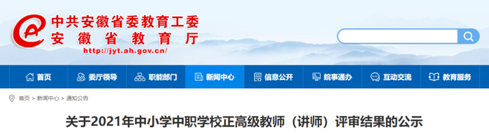 经2021年安徽省中小学正高级教师职称评审委员会、中等职业学校正高级讲师职称评审委员会评审,蒋信伟等99位同志通过中小学正高级教师职称评审,郭世杰等31位同志通过中等职业学校正高级讲师职称评审。现予以公示。公示期限为5个工作日(2022年月1日25至1月29日)。公示期间,如有异议,请本着实事求是的原则,提供具体线索并书面或发送电子邮件向安徽省教育厅师资处反映,邮编230061,邮箱sfc@ahedu.gov.cn。