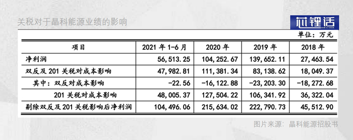 在晶科能源招股书中,我们也可以清晰的看到,关税对晶科能源最终的净利润影响极大,如果刨除双反跟关税的影响,那么其2021年上半年的净利润将达到10.45亿元,比最终净利润增长近85%。