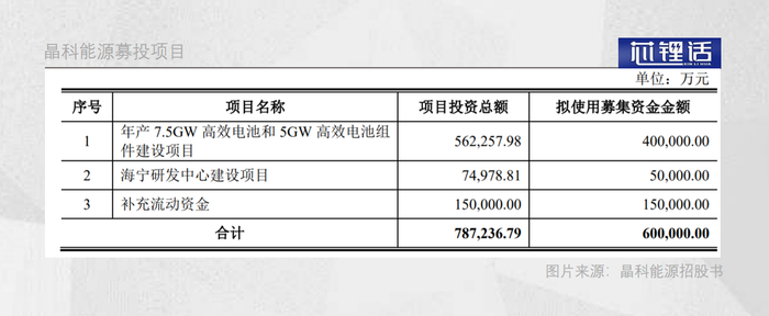 弥补电池片上的缺口,正是晶科能源此次IPO募集资金的主要用途之一。招股书显示,晶科能源将耗资56.23亿元建设年产7.5GW高效电池和5GW高效电池组件的项目。
