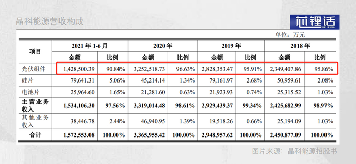 招股书显示,2018年-2020年晶科能源光伏组件营收在总营收中的占比在96%,是公司核心的盈利产品。