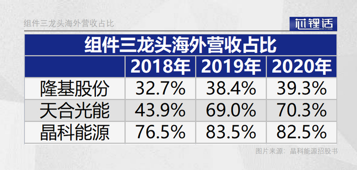 对于三家组件龙头公司隆基股份、天合光能、晶科能源的海外营收占比,晶科能源的海外营收占比远高于其他两家公司,而隆基股份则是占比最低的。