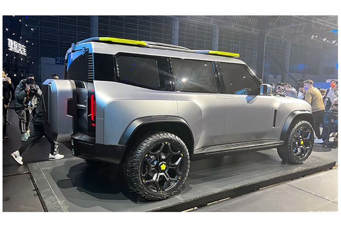 车身门把手为隐藏式设计,前后轮眉进行了熏黑处理。车顶行李架加入了亮色元素。车尾部分搭载了备胎箱设计,竖置尾灯符合越野车气质。