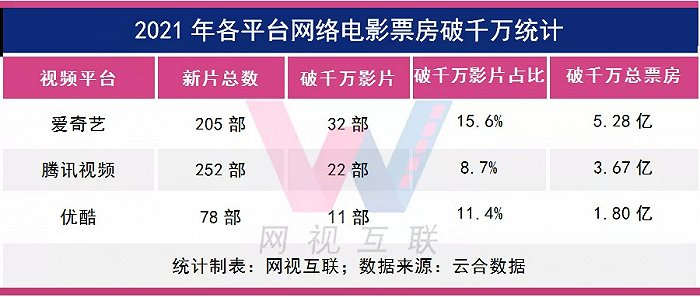 其中,爱奇艺单平台破千万影片高达32部,破千万影片数量占比15.6%,破千万影片累计分账票房5.28亿;腾讯视频单平台破千万影片22部,破千万影片数量占比8.7%,破千万影片累计分账票房3.67亿;优酷单平台破千万影片11部,破千万影片占比11.4%,破千万影片累计分账票房1.80亿。