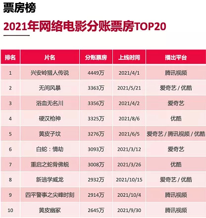 就单片票房来看,2021的票房冠军为腾讯视频独播的《兴安岭猎人传说》,分账票房4449万,网络电影依然未能打破票房天花板。