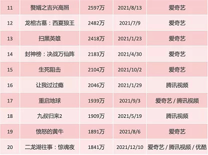 值得一提的是,2021年爱腾优上新网络电影公开分账票房总规模为19.6亿,如果加上PVOD影片、自制非分账影片、其他平台影片以及因票房不好未公开票房的影片,预计整体市场规模已超30亿。