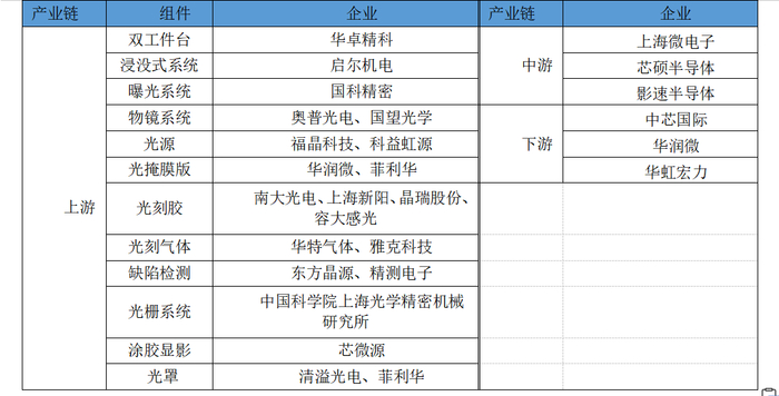 在光刻机产业链下游,中芯国际是全球领先的集成电路晶圆代工企业之一,中国大陆技术最先进、规模最大、配套服务最完善的专业晶圆代工企业,主要为客户提供0.35微米至14nm多种技术节点、不同工艺平台的集成电路晶圆代工及配套服务。在逻辑工艺领域,中芯国际是中国第一家实现14纳米FinFET量产的晶圆代工企业,代表中国大陆自主研发集成电路制造技术的最先进水平。中芯国际受至于美国出口管制条例,在28nm-14nm制程工艺领域份额较小,而收入主要在28nm以上制程工艺,但随着中心国际技术成熟和产能扩张,未来有望将进一步提高28nm以下制程工艺份额,加速抢占14nm制程领域份额。国产光刻机产业链见表2所示。