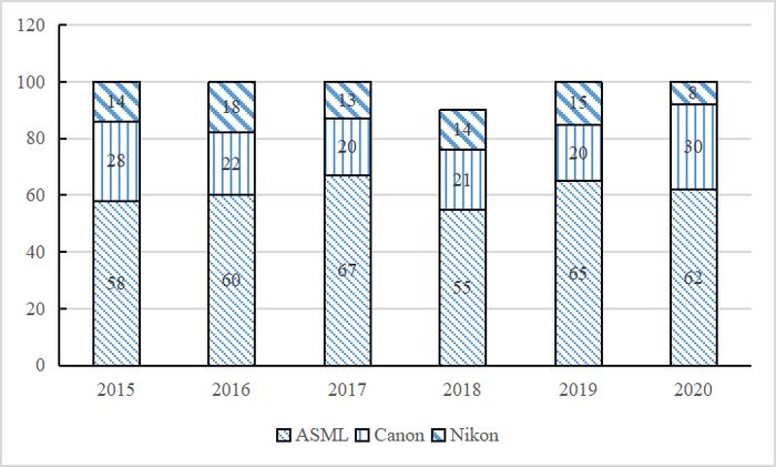 光刻机的技术决定了集成电路的高度。因此,芯片制造以及背后的光刻机技术成为了美国对华科技封锁的缩影。目前,光刻机市场是典型的“三分天下”格局。(ASML)、尼康(Nikon)、佳能(Canon)市场占有率超过90%,是典型的寡头垄断市场,而ASML更是垄断最高端的极紫外(EUV)光刻机市场。光刻设备对光学技术和上游供应链的要求非常高,光刻机技术是全球化带来技术进步的结果,无明显的政府干预手段,这充分表明光刻机产业的垄断性并非如供水、供热等市政公用行业的区域性、局部市场的自然垄断,而是全球性的自然垄断,其垄断性质更强。