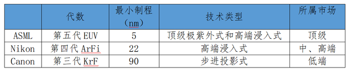 目前,高端光刻市场已经被荷兰的ASML完全占领。由于技术水平不足,Nikon和Canon在7nm及以下制程芯片的制造能力已落后于ASML。当前,技术最为先进的是ASML研发出的EUV光刻机,能够适配7nm到5nm制程芯片的设计制造。Canon将其业务重点放在中低端的光刻机市场,主要制造封装光刻机、LED光刻机和面板光刻机。Nikon则处于追赶ASML的状态,Nikon的光刻机范围广泛,从采用独特的多镜头投影光学系统处理大型面板到制造职能设备中的中小型面板,充分发挥了其在面板(FPD)光刻方面的比较优势。目前,Nikon仍然主推ArF浸没式技术,EUV技术的运用尚不成熟,光刻工艺距离ASML仍有不小差距。光刻机三大公司技术现状如表1所示。整体上,Nikon和Canon主要占据中低端市场。