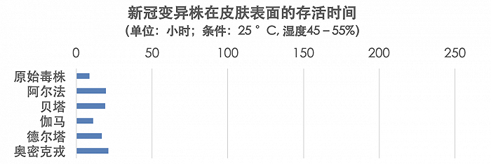 在人体皮肤表面,新冠病毒的存活时间要短得多,原始毒株只能存活8.6小时,而奥密克戎也可以存活得久一点,有21.1小时。