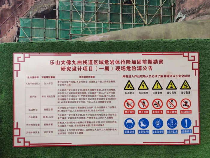 此项目名为“乐山大佛九曲栈道区域危岩体抢险加固前期勘察研究涉及项目”,据央视新闻报道,九曲栈道崖壁脚手架已经全部搭设完成,勘查研究所需的裂缝计、震动测量仪等勘测仪器都已安装到位,开始大数据采集工作。