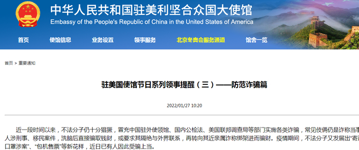 1月27日上午,中国驻美国大使馆连发三条重要提醒,涉及疫情防护、社会治安和防范诈骗等。