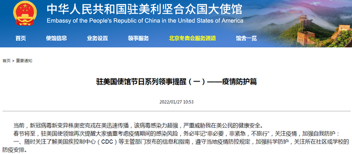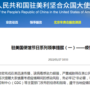 中国驻美国大使馆网站1月27日上午信息显示,驻美国使馆发布节日系列领事提醒,在“疫情防护篇”中称,当前,新冠病毒新变异株奥密克戎在美迅速传播,该病毒感染力超强,严重威胁我在美公民的健康安全。