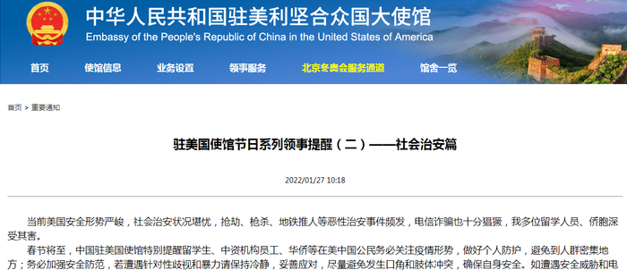 驻美国使馆1月27日发布节日系列领事提醒,在“社会治安篇”中称,当前美国安全形势严峻,社会治安状况堪忧,抢劫、枪杀、地铁推人等恶性治安事件频发,电信诈骗也十分猖獗,我多位留学人员、侨胞深受其害。