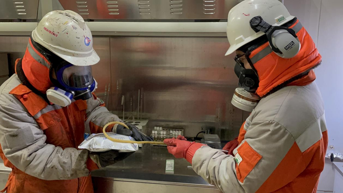 有着两年工作经验的两位操作工,头戴防毒面具,手着防静电手套,驾轻就熟、密切配合。环境温度达到了零下十几摄氏度,他们的防毒面具里面已经凝结了一层水雾。