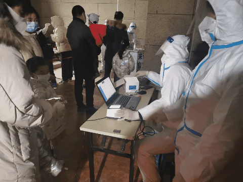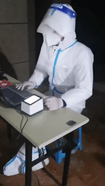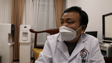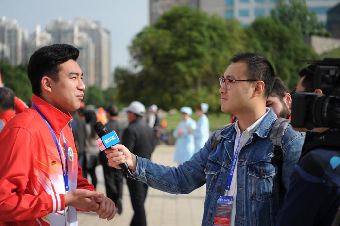 ↑马文轩(左)在2018年的一场马拉松赛上担任医疗志愿者时接受记者采访。