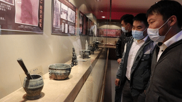 ↑马文轩(左一)和同学参观校内的医史博物馆。