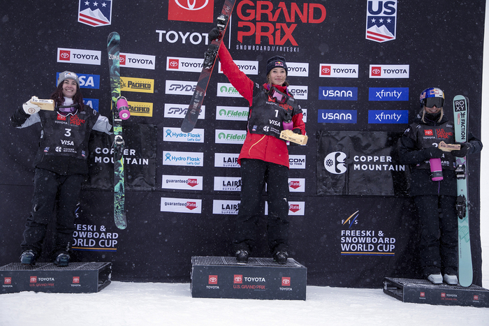 2021年12月,在自由式滑雪大跳台世界杯美国斯廷博特站比赛中,谷爱凌纵身一跃、腾空翻转、完美落地,一气呵成之下,完成右转两周偏轴转体1440度的动作,夺下金牌的同时,成为世界上首位在正式比赛中完成这一动作的女运动员。