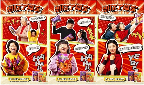在场景上,不再是“螺蛳粉被嫌弃的一生”或“一个人深夜孤独地嗦粉”,而是营造春节回家送臭宝的分享式场景,亲友、情侣、朋友,甚至是主人与宠物之间,都能用一声臭宝、一碗臭宝来传达礼仪、表达爱意。这样连接情感的螺蛳粉,才是真正的社交货币。