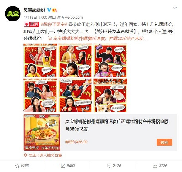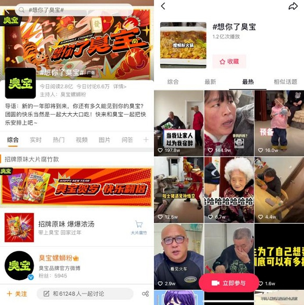 螺蛳粉新品牌臭宝打破常规、大胆造梗。在春节临近之际,以#叫百岁老人臭宝#、#想你了臭宝#两个话题先后登上热搜。其中#想你了臭宝#话题,当日在微博的阅读量高达2.8亿、讨论量达6.6万,在某音的播放量高达1.2亿。
