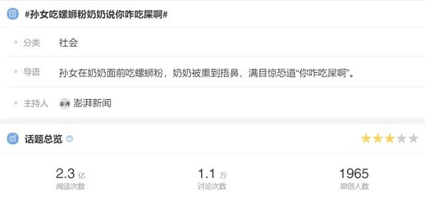 在少则几十次多则上百次的轮番热搜里,有创意吃法、探店测评,有搞笑场景、行业动态,却很难找到亲友间嗦粉的快乐场景,玩的梗也一直停留在螺蛳粉的“臭”,难有新意。