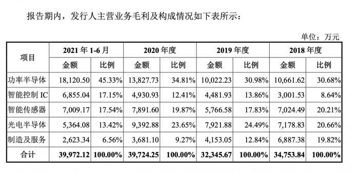 招股书显示,比亚迪半导体主营业务为功率半导体、智能控制IC、智能传感器、光电半导体的研发、生产及销售,以及提供晶圆制造、封装测试等服务。其中功率半导体收入贡献度最大,2018—2020年以及2021年1-6月,功率半导体营收分别为4.38亿元、2.97亿元、4.61亿元、4.65亿元,占总营收比例分别为33.04%、27.7%、32.41%、38.07%。据了解,功率半导体产品除供应比亚迪集团外,已进入小康汽车、宇通汽车、福田汽车、瑞凌股份、北京时代、英威腾、蓝海华腾、汇川技术等厂商的供应体系。