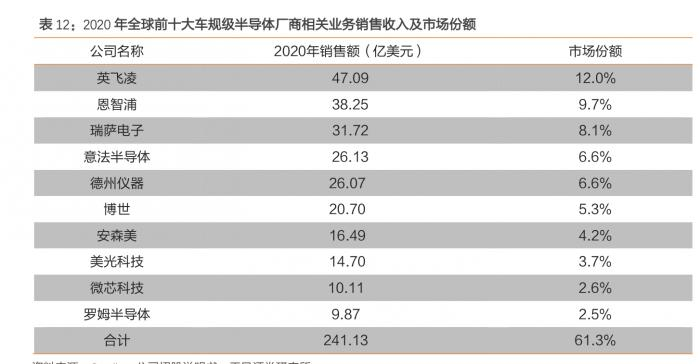 从全球市场竞争格局来看,国际厂商在车规级半导体领域中占据领先地位,车规级半导体国产化率较低。数据显示,2020 年全球前十大车规级半导体厂商中无国内企业,英飞凌、恩智浦、瑞萨电子排名前三,2020年销售额分别为47.09亿美元(约300亿元)、38.25亿美元(约243亿元)、31.72亿美元(约200亿元),市场份额分别为12%、9.7%、8.1%。
