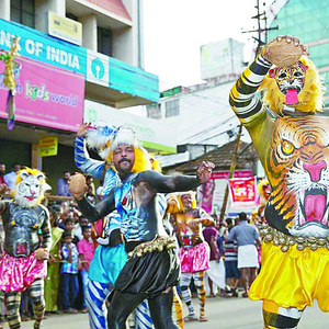 在印度南部的喀拉拉邦,每年八九月份都会上演一出人人期盼的重头戏——普利卡莉老虎节。这是庆丰收的重要程序,因为在印度多个地方人们相信老虎能带来风调雨顺,反之如果得罪了老虎则会发生旱灾。“普利卡莉”就是老虎跳舞的意思。节日最有意思的就是会有多达七八百人在身上进行人体彩绘,用油彩在胸腹部画上大大的虎头,四肢画上虎纹,然后再戴上虎头面具,伴着音乐游街起舞。拥有大肚腩的男性在这个活动中更有优势,因为大肚子正是虎口的位置,当他们伴着鼓声抖动肚子的时候,老虎就会显得更加威风凛凛、杀气腾腾。