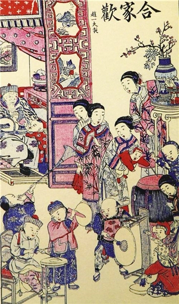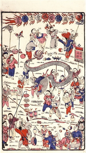 年画原先叫做“纸画”“画贴”“欢乐图”,乃春节用以装饰门户和住宅的传统艺术品,堪称民间绘画的一朵奇葩。其起源很早,及至明清两代木版年画进入巅峰期,天津杨柳青、山东潍坊杨家埠、苏州桃花坞、广东佛山等地成为主要产区。晚清上海旧校场年画虽属后起之秀,却也曾独树一帜,成为我国年画杰出代表之一。