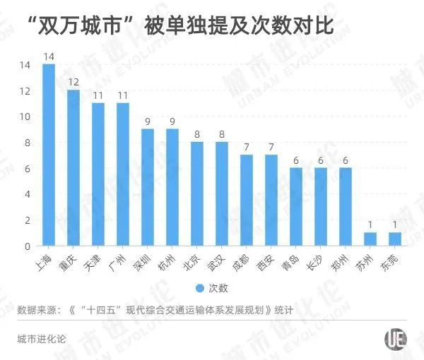 GDP破万亿、常住人口破千万,“双万城市”集人财于一身,是交通脉络上的关键节点。而在目前全国15座“双万城市”中,《规划》单独提及次数,天津以11次高居第三名,仅次于上海的14次和重庆的12次,与广州并列。