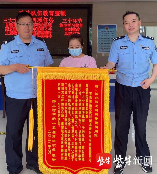 2021年6月高考期间,董明在上班途中看见一名学生在路边哭泣,上前询问得知,他家的电瓶车坏了,小区门口的修车店还没开门,早高峰又打不到车。董明听说后,二话不说将他拉到了自己的电瓶车后座上,一路驰骋准时将他送到考场。事后,考生的妈妈知道了这件事,经多方打听总算知道了这个好心人就是城北派出所的老董。为了表达感激之情,她特别订制了一面165字的锦旗送到了派出所。该事迹被包括紫牛新闻在内的多家媒体宣传报道,这面锦旗,也被网友称为“史上最长”锦旗。