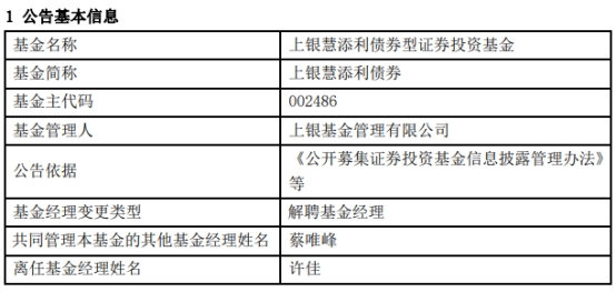 (原标题:许佳离任上银慧添利债券 蔡唯峰独立管理)