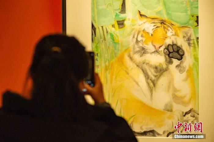 1月21日,中国农历虎年渐近,市民在位于北京的中国国家博物馆的“瑞虎佑安——二〇二二新春展”上欣赏《猛虎半日闲》画作。中新社记者 侯宇 摄