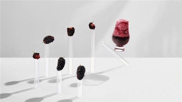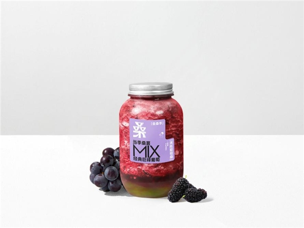桑暴柠、满瓶葡萄桑分别加入爆打后的香水柠檬片与手剥新鲜巨峰葡萄果肉。前者以桑葚的酸甜佐以柠檬的香气与鲜感,吸入满口香气的同时,伴随着新鲜多汁桑葚果肉特有的噗呲破皮声,更加清新。满瓶葡萄桑则以多次尝试后确定的桑葚与葡萄比例,带来酸甜平衡的风味和两种不同的多汁口感——巨峰葡萄果肉与颗粒感分明的桑葚粒同时在口腔内交汇,鲜甜汁水迸发之后还有淡淡绿妍茶香回韵。