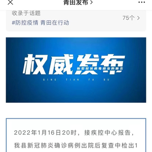 1月16日晚,“青田发布”发文称,接疾控中心报告,青田县新冠肺炎确诊病例出院后复查中,检出1份标本新冠病毒核酸阳性。该患者乘坐航班从西班牙马德里出发,于2021年8月14日在杭州入境,确诊后在西溪医院治疗。