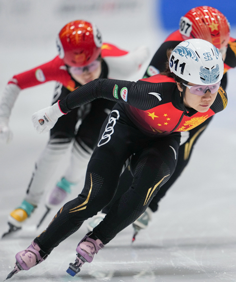 2022年1月13日至14日,短道速滑项目北京冬奥会选拔赛第二、第三站在北京首钢园进行。图为吉林选手韩雨桐(前)在比赛中。视觉中国供图